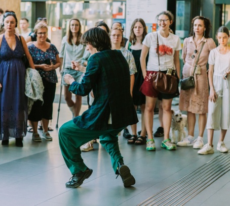 W teatrze może to oznaczać np. wejście w środek sytuacji bycia w podróży, której cel nie jest znany, ale trzeba iść dalej. Tak jest w naszym spektaklu „Odyseja”, granym na dworcach z widzami podążającymi za tancerzami z indywidualnymi zestawami słuchawkowymi. Dzięki temu sami mają okazję przeżyć nieoczywistą podróż w głąb siebie. Te same rozwiązania, których używamy w spektaklu, mogą pomóc klientowi lub partnerowi biznesowemu zrozumieć sposób działania i cele danej organizacji, poznać kluczowe dla niej odpowiedzi na pytania „dlaczego?” i „jak?”, a jeśli trzeba, także „co?”. Zrozumiałość i wartość takiej propozycji dla przedsiębiorców sprawdziliśmy już kilka razy, ostatnio podczas Rethink Digital Fest w Łódzkiej Specjalnej Strefie Ekonomicznej. Początkowe wątpliwości uczestników będących na codzień daleko sztuki szybko ustępowały uśmiechowi i zanurzeniu się w stworzonym przez nas świecie.