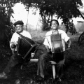 Legendary concertina player from Łowicz, Leopold Talarowski with his son Jan. Czatolin 1960 [photo from author's archives]