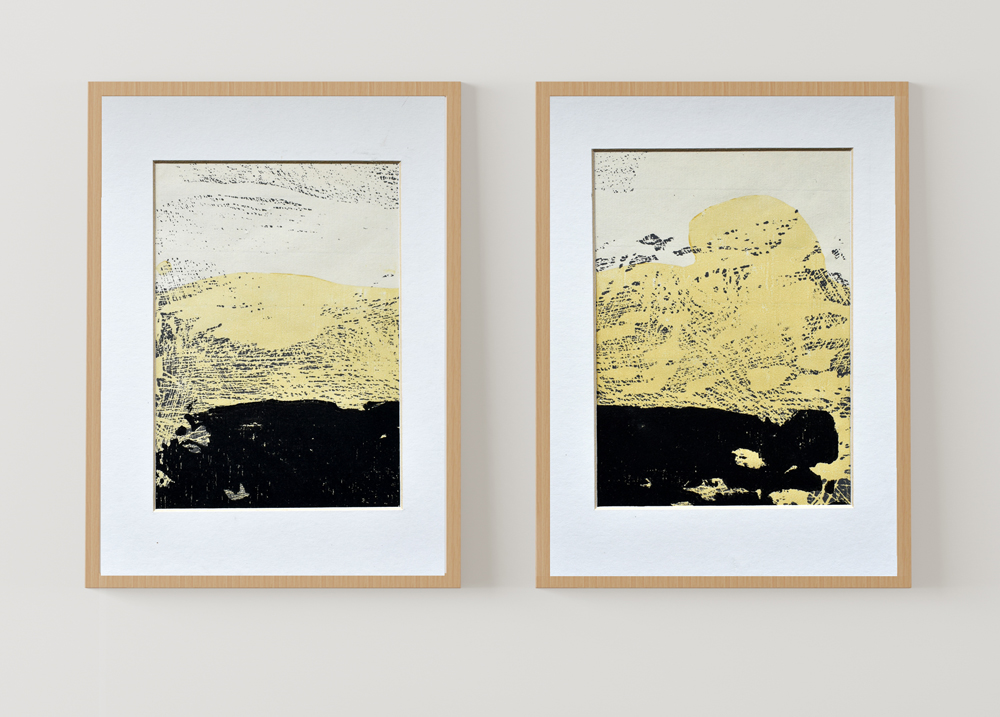 Dyptyk z cyklu „Taki pejzaż” drzeworyt/linoryt/gipsoryt. Format: 12x18 cm, 2025