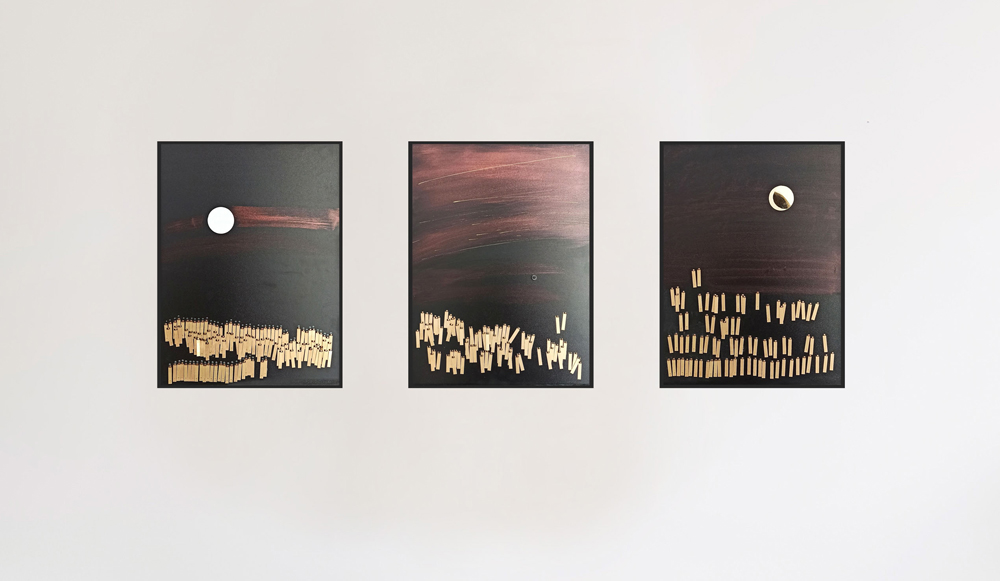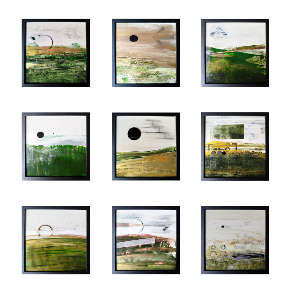 Prace z cyklu „Taki pejzaż – zapisy przestrzeni”, assamblage. Format: 20x20 cm, 2024