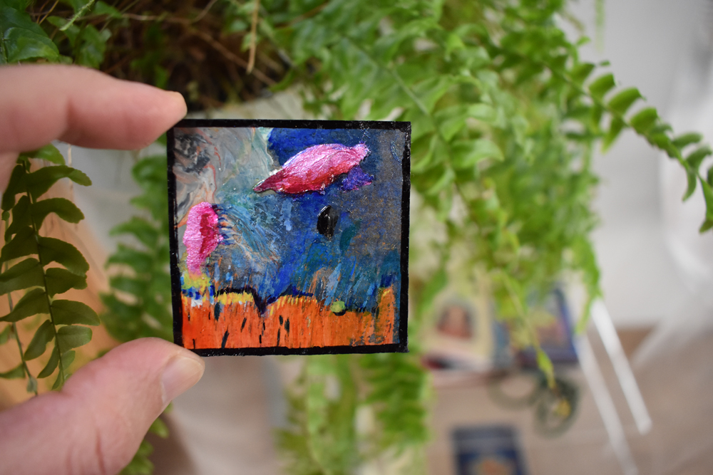 „Ocean szczęścia” akryl na impregnowanej tekturze. Format: 5x5 cm, 2022 Jestem dumna z… tego, że pomimo wielu trudności nigdy się nie poddałam, i oczywiście z mojej córki, która kroczy własną ścieżką, podejmując odważne decyzje i którą żartobliwie nazywam „najlepszym projektem mojego życia”.